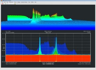 Our open-source spectrum analyzer software features a 2-D waterfall or 3-D topographical view, as well as a GPU-accelerated color persistence mode. Normally