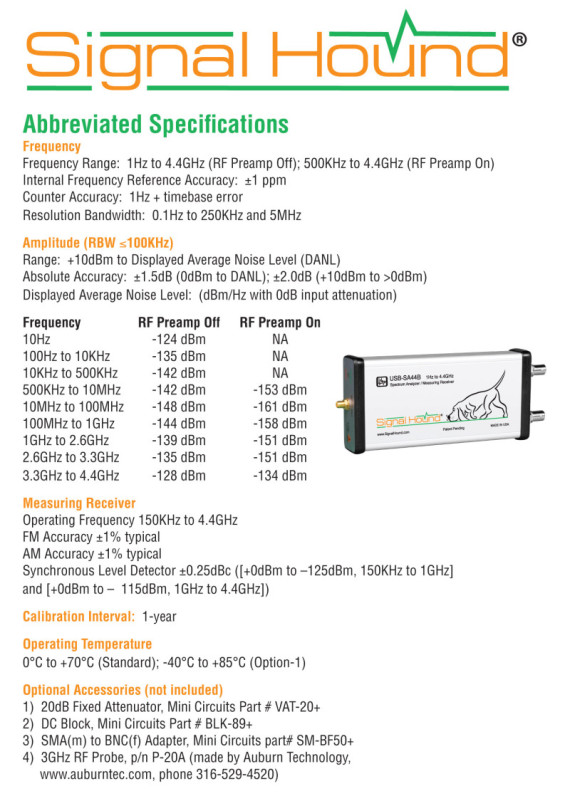 The original USB-SA44 has sold out! Our new "B" model has added a preamplifier for improved sensitivity and reduced LO leakage. There is also a thermometer for temperature corrections, allowing accurate amplitude measurements over the entire operating temperature range.
