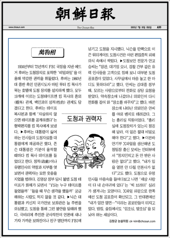 ▶ 후버는 대통령이 싫어하는 인사들의 도청자료를 대통령에게 제공하곤 했다. 존슨 대통령은 기분이 울적할 때마다 킹 목사 테이프를 들었다고 한다. 정적(政敵)이나 유명인사의 약점과 치부를 엿보면서 권력자는 묘한 웃음을 지었을 법하다. 김영삼 정부 당시 불법 도청 테이프가 화제가 되면서 ‘YS는 누구 테이프를 들었을까' ‘들을 때 무슨 생각을 했을까' 궁금해